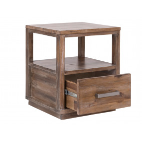 Noční stolek Woodstock je vyroben z akátového dřeva a zaujme svou speciální dřevěnou konstrukcí. Rustikální dřevěný povrch dostal matnou úpravu a je tak chráněn před vnějšími vlivy. Malý odkládací stolek nabízí vedle vaší postele perfektní prostor pro noční čtení, noční lampičku a budík. Všechny ostatní důležité věci najdou své místo v šuplíku. Doplňte celkový obraz v ložnici rustikálním nočním stolkem Woodstock.