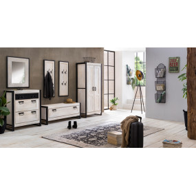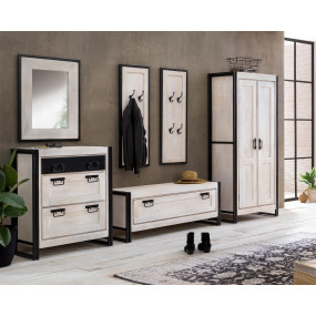 Autentický design, řemeslné zpracování a skandinávský inspirovaný povrch v „white wash“ – to je to, co dělá tento kus nábytku tak odlišným. Předsíňová skříň z mangového dřeva nabízí za 2 neprůhlednými otočnými dvířky na 3 policích dostatek úložného prostoru pro nejrůznější věci. Spodní police je pevná. Bundy a kabáty lze snadno uložit na šatní tyč, která je odnímatelná. Možnosti využití tohoto krásného kusu nábytku jsou téměř neomezené, ať už soukromě, v praxi nebo v advokátních kancelářích. Černý kovový rám a kliky dveří vytvářejí atraktivní kontrast.